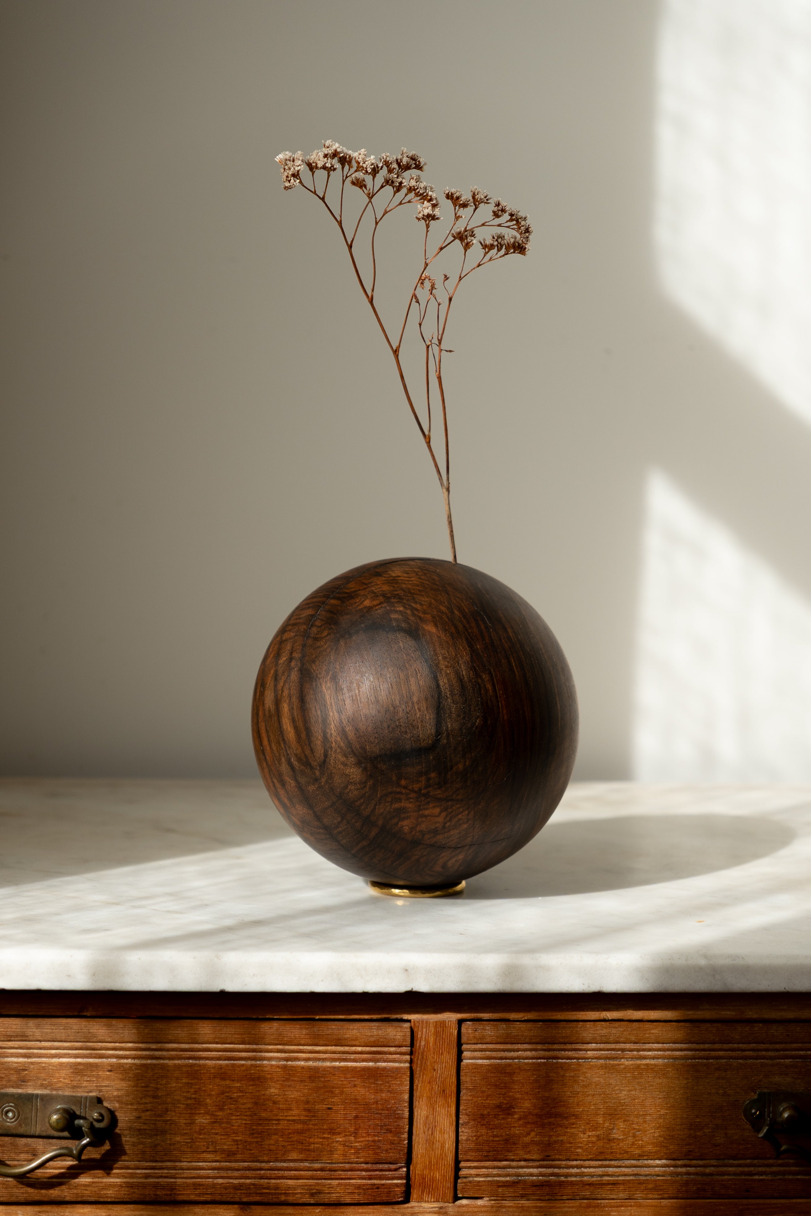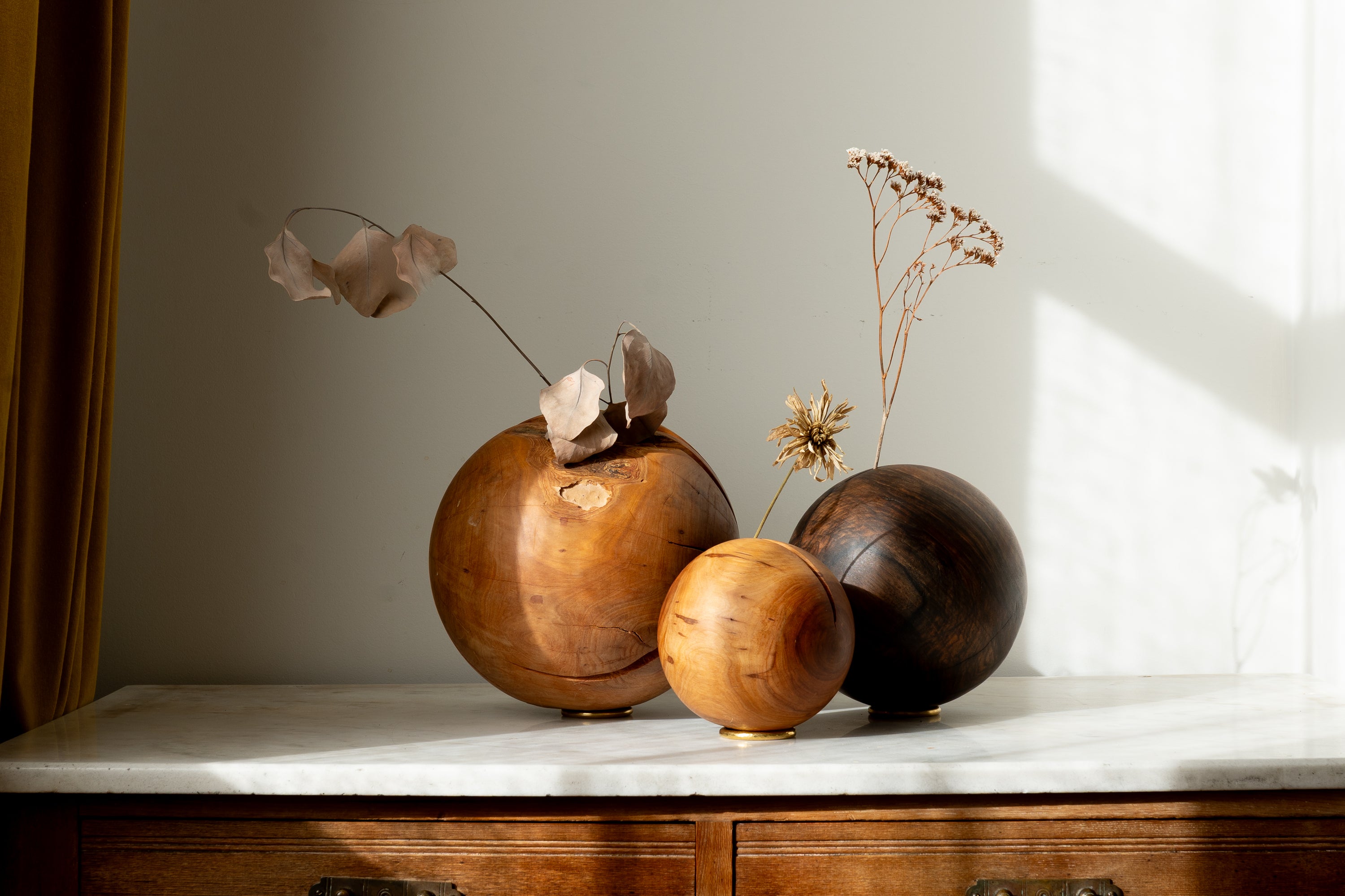 The wooden spheres of Bàle are crafted by an artisan based in Friuli, near the border with Slovenia. Working exclusively with storm-felled and broken trees collected from the surrounding woods, the maker shapes each piece by hand, allowing the natural forms and imperfections of the timber to guide the final object.
