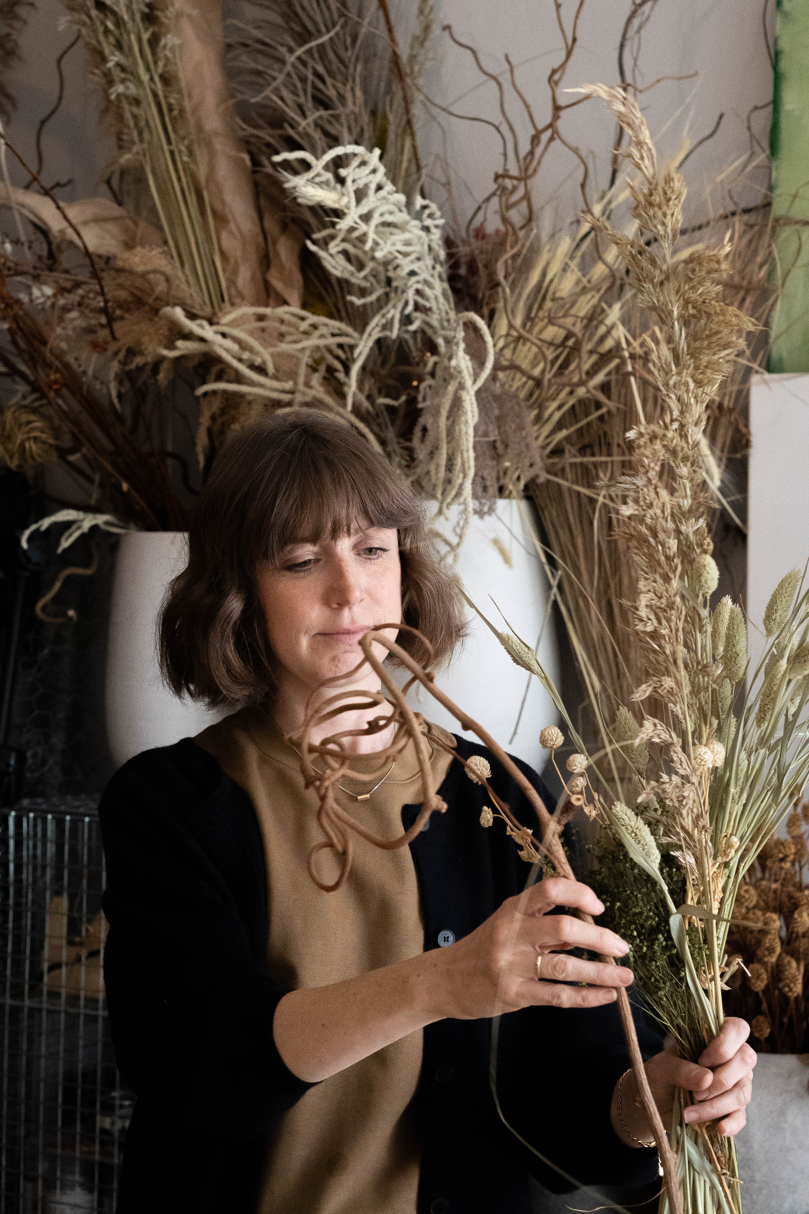 she translates her love of texture, form, and negative space into floral designs that feel more like immersive sculptures than traditional arrangements. Guided by the Japanese philosophy of wabi-sabi, her work embraces imperfection and celebrates the raw, fading beauty of dried flowers, creating installations and bouquets that are both contemporary and timeless.